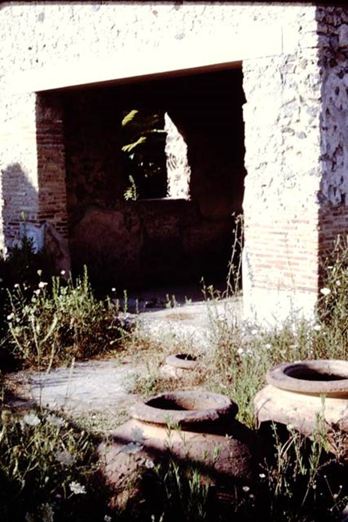 Looking north-east to small room, with large dolium buried in the soil at the edge of the soil, and two further dolia nearby.