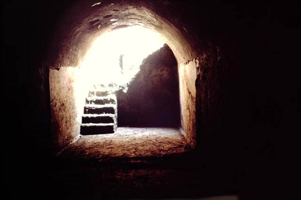 East wall with remains of painted Lararium on east wall of vineyard, with steps to cellar. Photo by Stanley A. Jashemski.