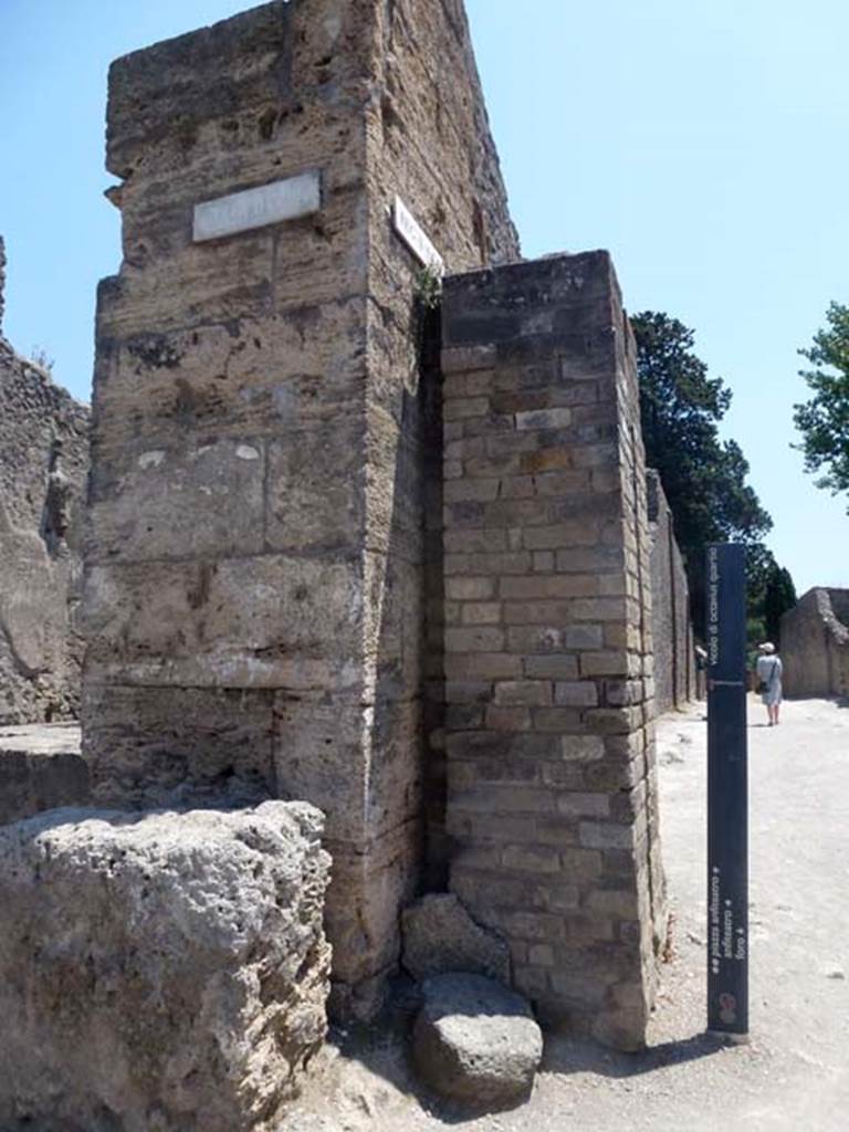 II.2.1 Pompeii. December 2005. Side wall (on left) with restored water column on Vicolo di Octavius Quarto.