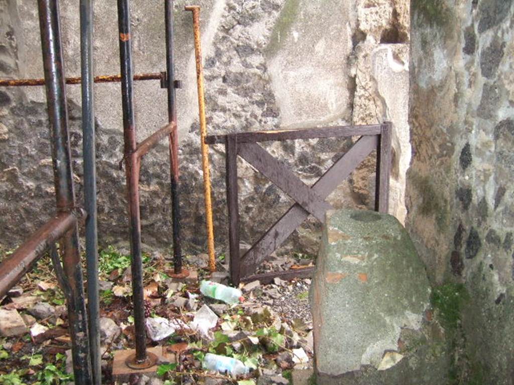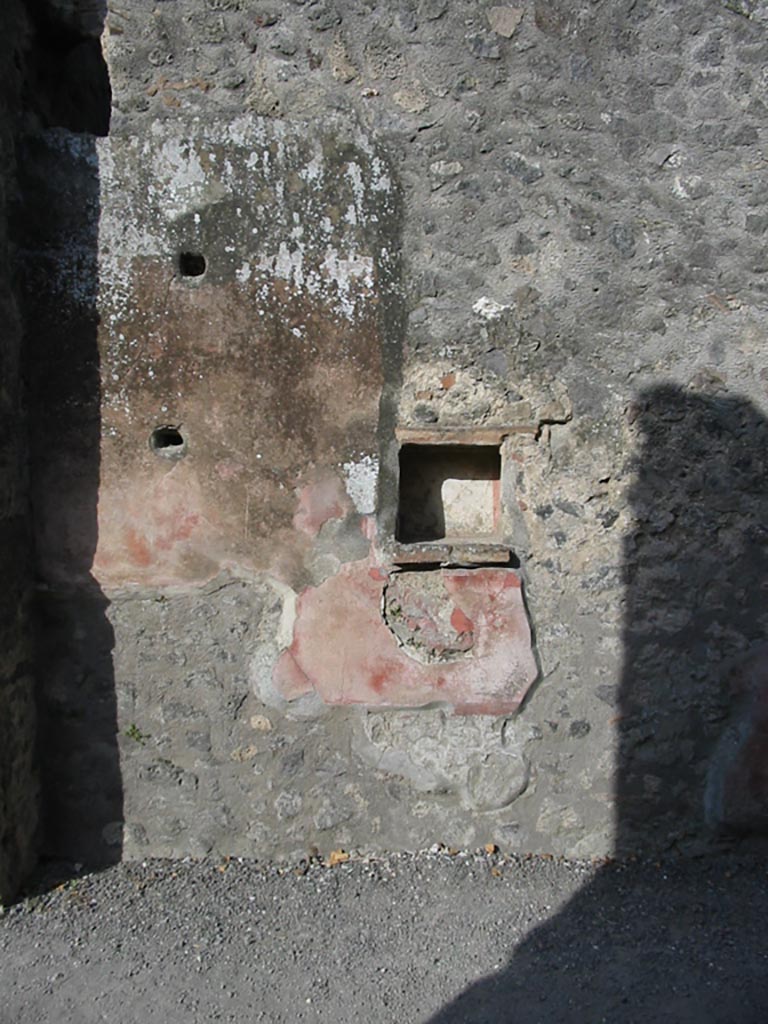 According to Boyce, in the east wall was a square niche with heavy projecting ledge. Its inside walls were white, bordered in red and around the top ran a stucco cornice. A similar cornice ran around three sides of the niche on the wall outside, to judge from the one side where the plaster was preserved. On the edge of the projecting shelf was a graffito. See Della Corte, M., 1965. Case ed Abitanti di Pompei. Napoli: Fausto Fiorentino. (p.379, CIL IV 8489). See Boyce G. K., 1937. Corpus of the Lararia of Pompeii. Rome: MAAR 14. (P.30, no.63, Pl.4, 3, the location given as II.v.3)