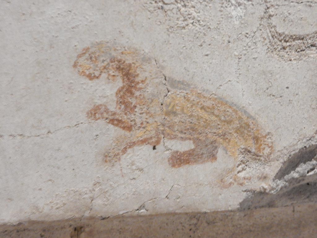 Room 4, detail of remains of decoration (lion?) from middle of central panel on south wall. Photo courtesy of Buzz Ferebee.