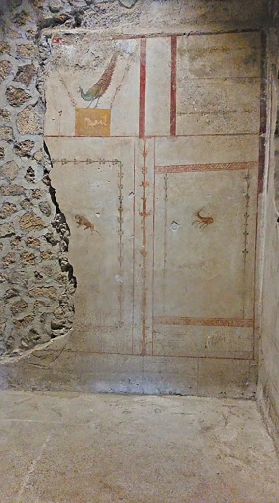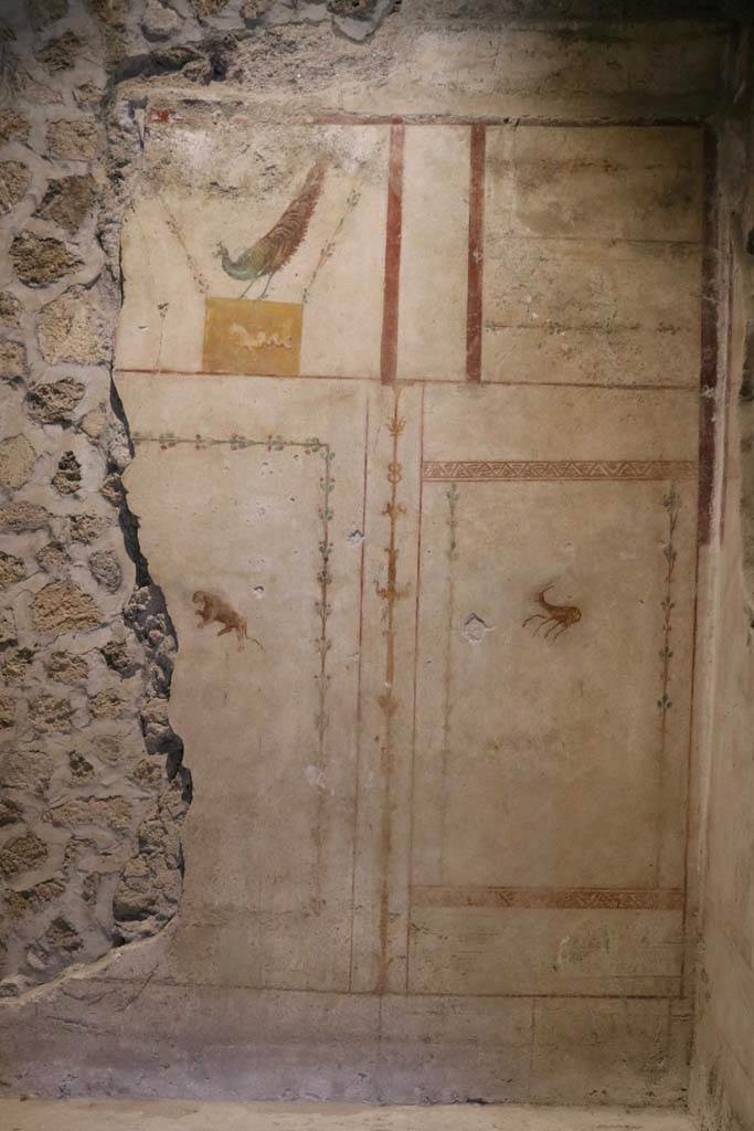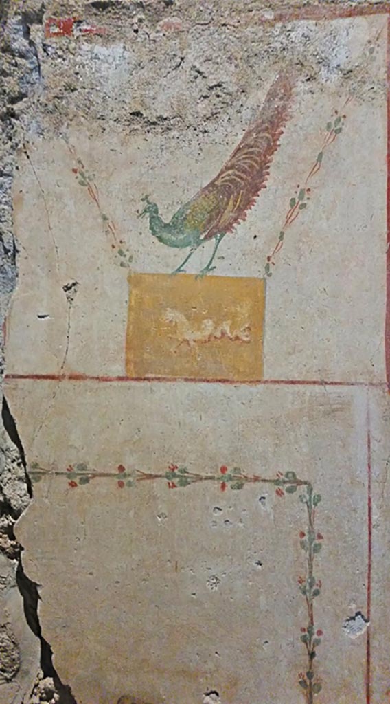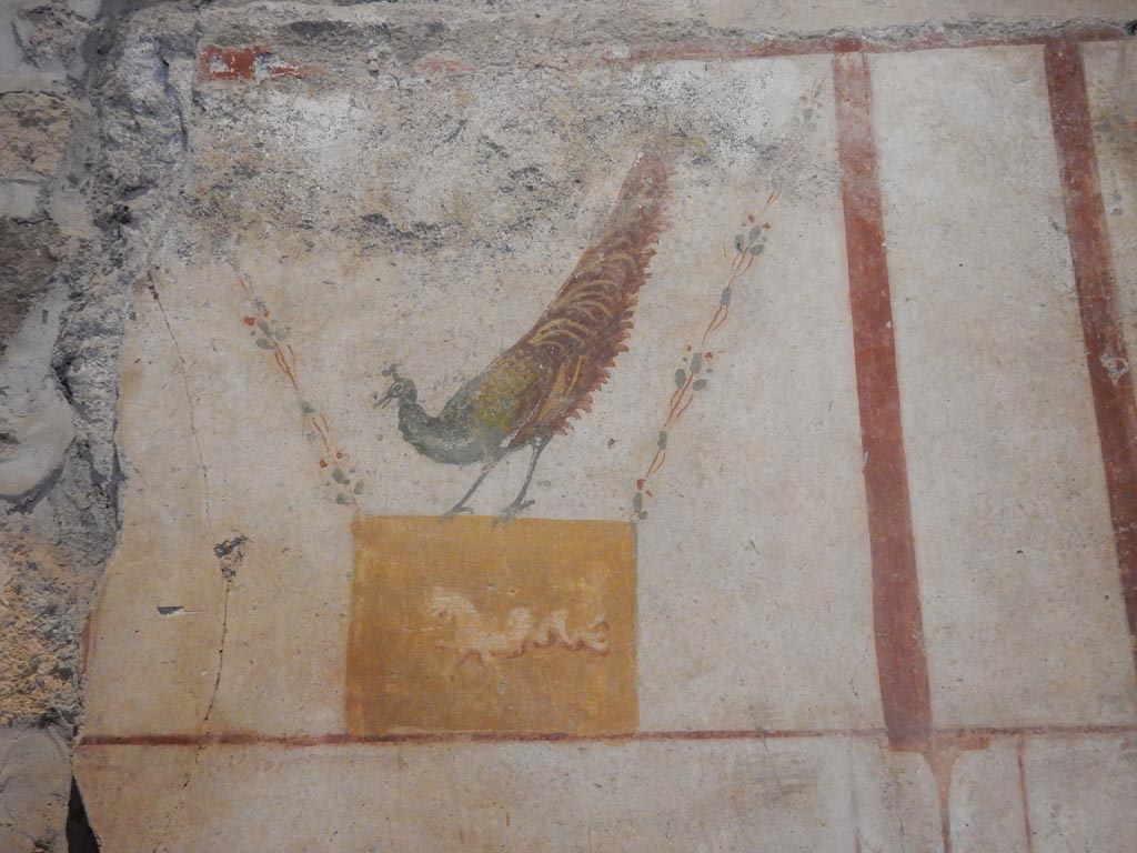 II.9.4 Pompeii. May 2018. Room 4, detail of painted peacock from centre of upper east wall. Photo courtesy of Buzz Ferebee.