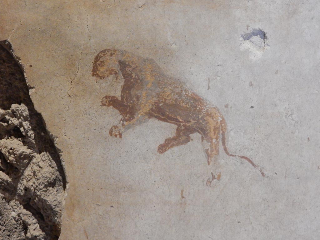 II.9.4 Pompeii. May 2018. Room 4, detail of panther from centre of middle panel on east wall. Photo courtesy of Buzz Ferebee.