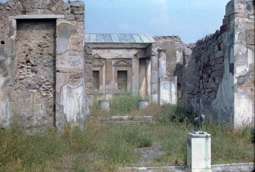 V.1.7 Pompeii, 7th August 1976. Room 1, looking from atrium with model of bull in situ, across tablinum to peristyle area.