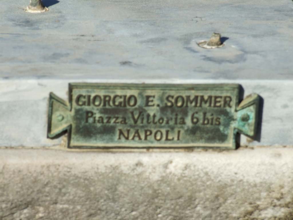 Room 4, atrium. Pedestal on impluvium. Plaque with name of Giorgio E. Sommer of Piazza Vittoria 6 bis NAPOLI.