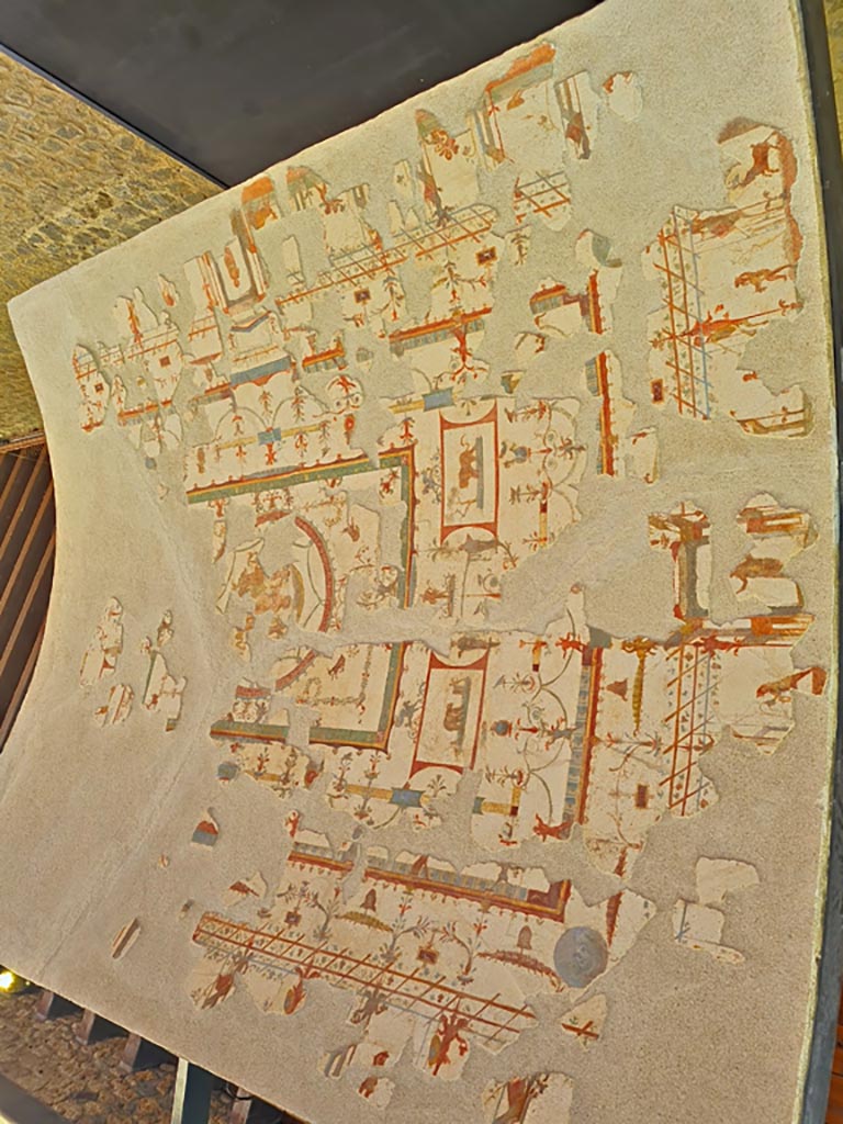 “The collapsed ceiling of the cubiculum was discovered in fragments on the floor and reassembled after restoration work.