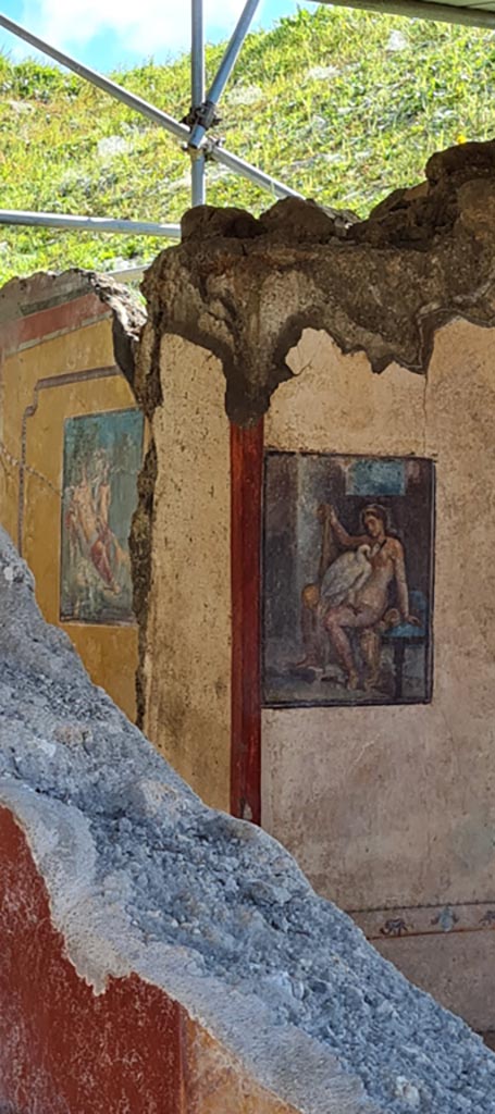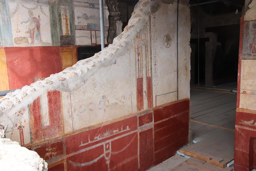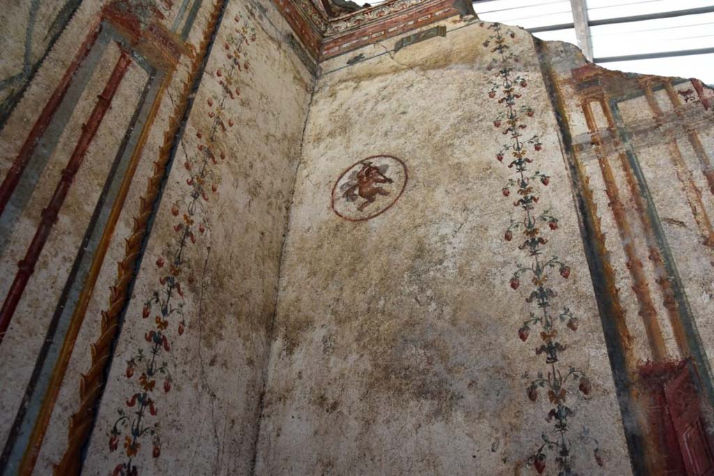 Looking south from entrance corridor over wall into cubiculum Amb. 9 with Leda and the Swan fresco. Photo courtesy of Giuseppe Ciaramella.