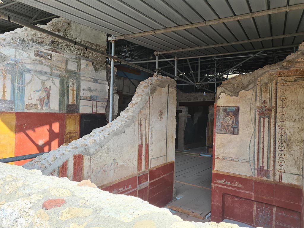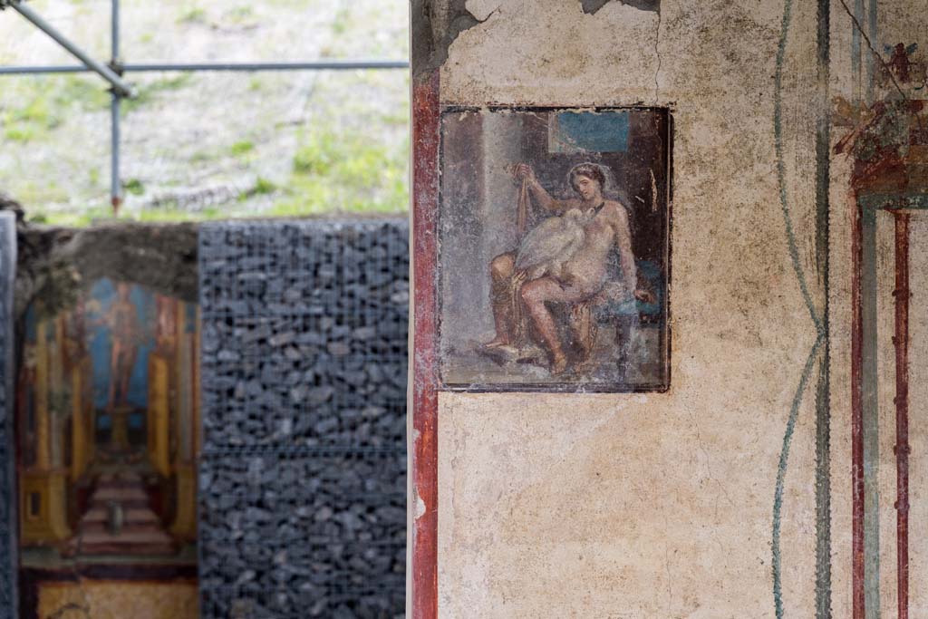 Looking east in cubiculum Amb. 9, with painting of Leda and the Swan. The atrium with a painting of Mercury is at the rear.