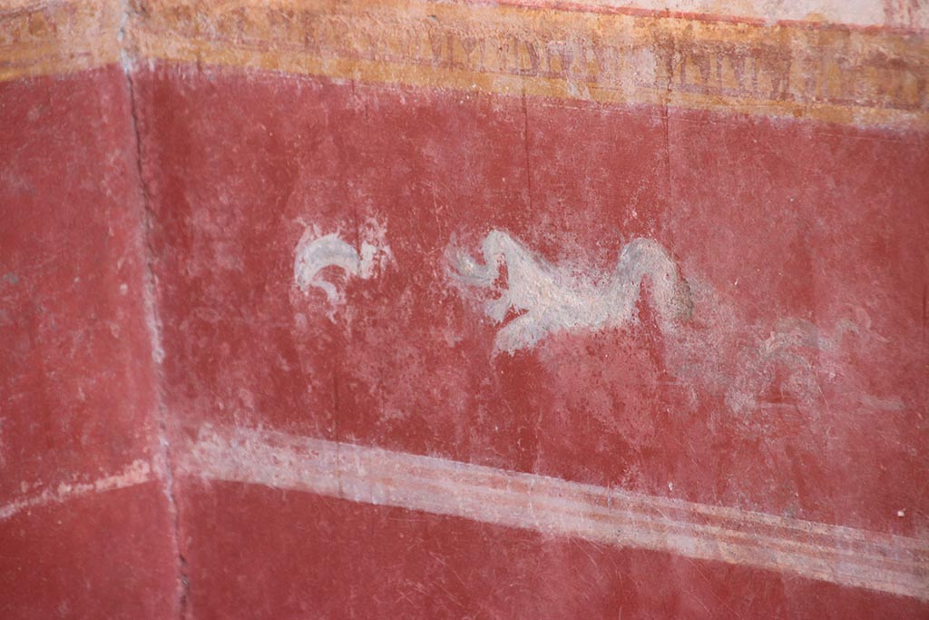 Cubiculum 9, painted dolphin and sea creature in zoccolo/dado at east end of south wall. Photo courtesy of Klaus Heese.