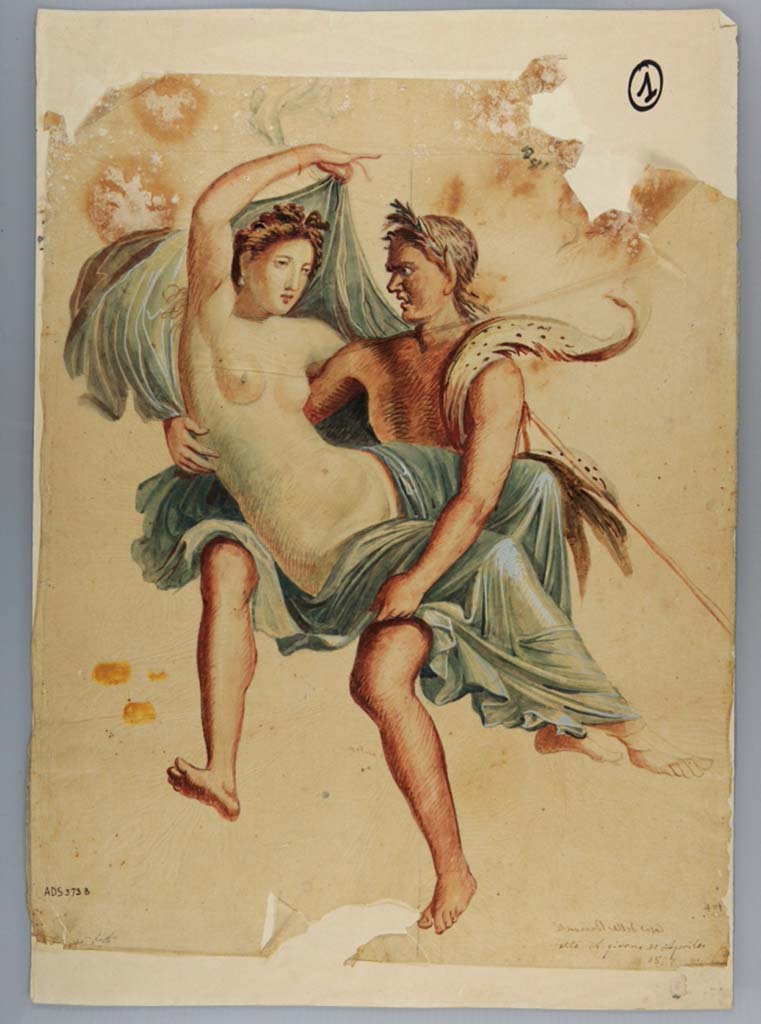 Drawing of wall painting with figures of Satyr holding Dionysus.
