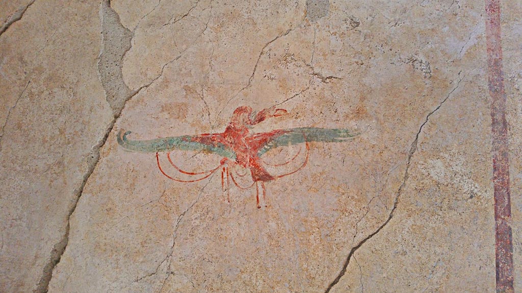 VI.15.8 Pompeii. May 2015. Detail of painting of flying swan from panel on west wall of cubiculum. Photo courtesy of Buzz Ferebee.