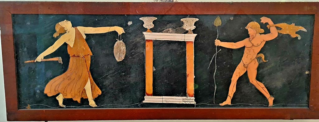 Found in tablinum on 22nd May 1845. Dionysian scene in coloured marble. Photo courtesy of Giuseppe Ciaramella. September 2024.