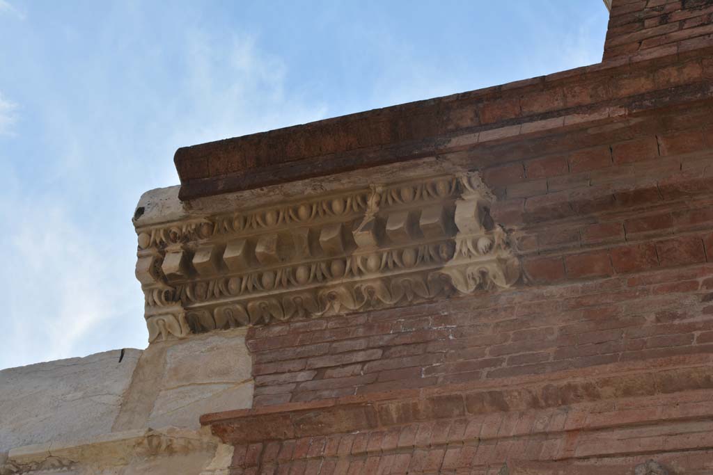 VII.9.7/8 Pompeii. August 2021. Detail at top of columns in north-east corner of Forum, outside Macellum.