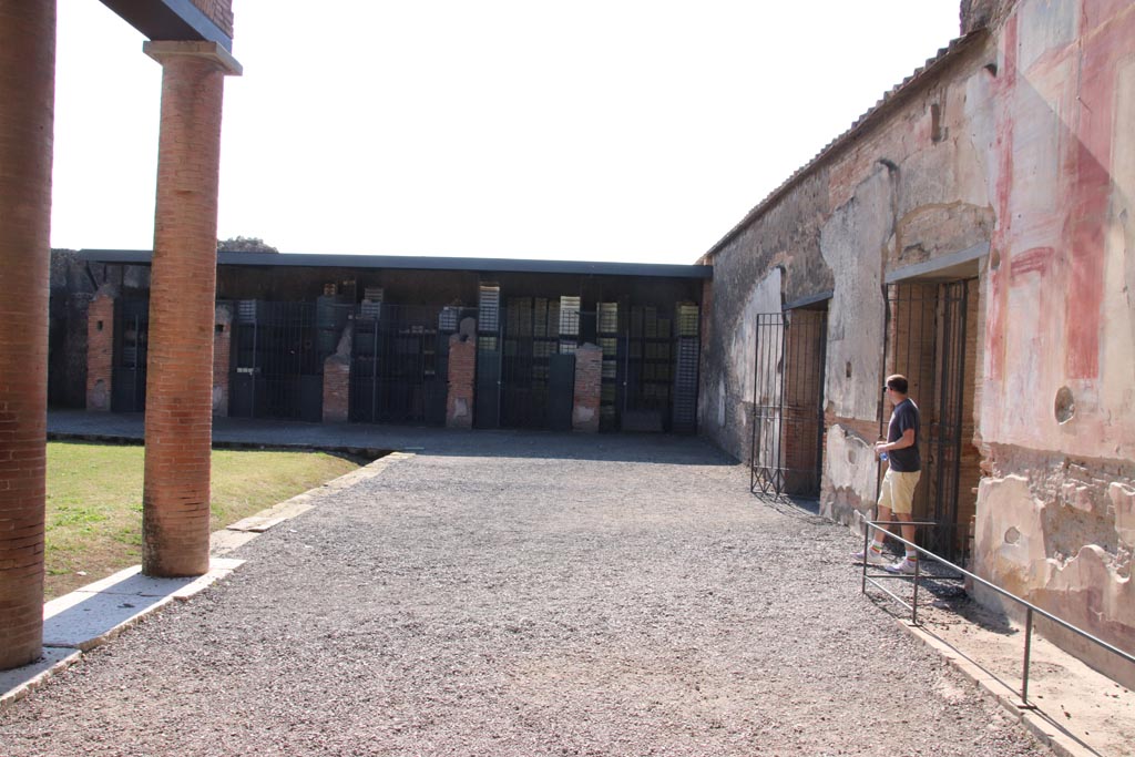 VII.9.8 and 7 Pompeii. August 2021. Looking east across statue bases towards entrance doorways.