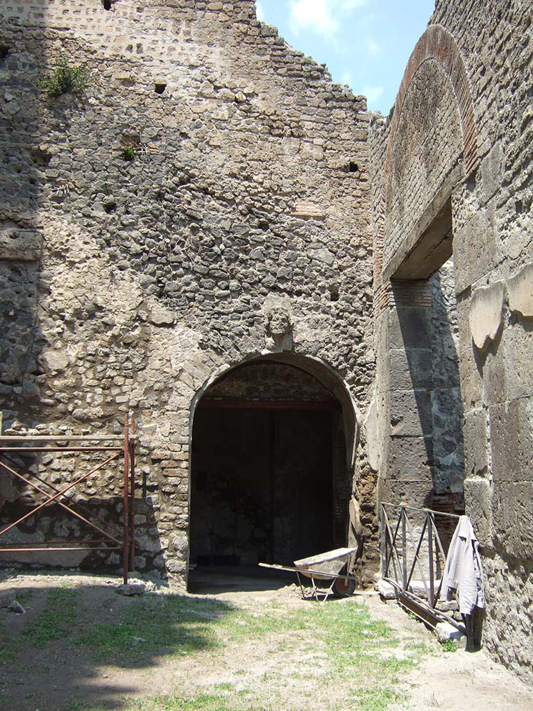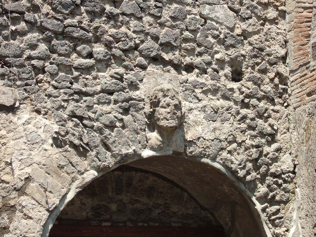 VIII.7.20 Pompeii. May 2006. West side. Head (keystone) over entrance to room under the seating.