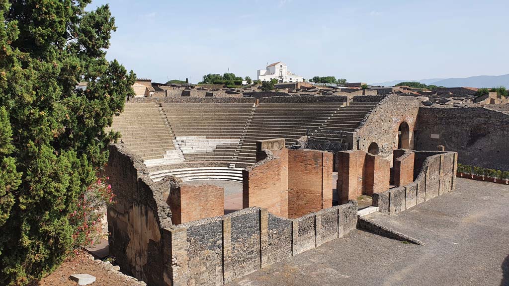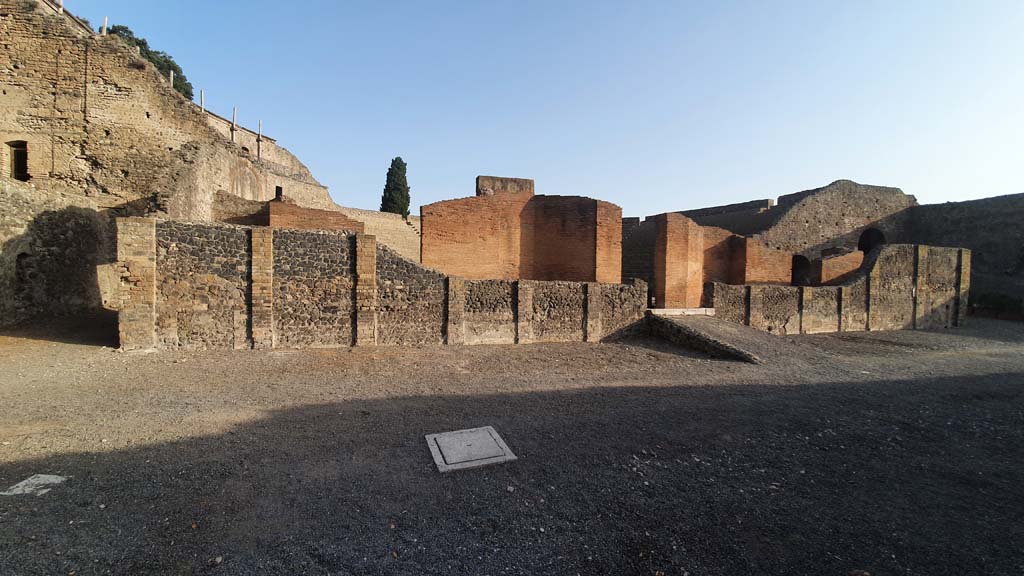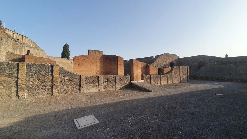 VIII.7.20 Pompeii. August 2021. Looking down from Triangular Forum towards area on west and south side of stage.