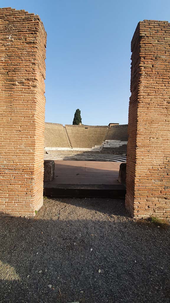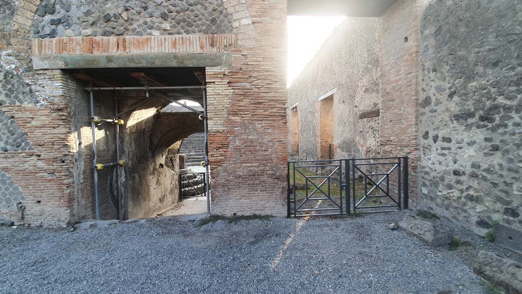 VIII.7.20 Pompeii. August 2021. Looking north through entrance to stage.