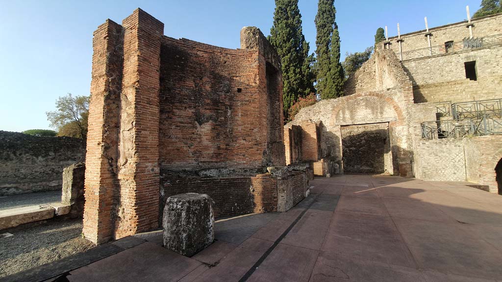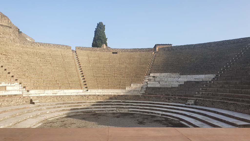 VIII.7.20 Pompeii. August 2021. East side. Looking south in area near the stage, with entrance to stage, on right.