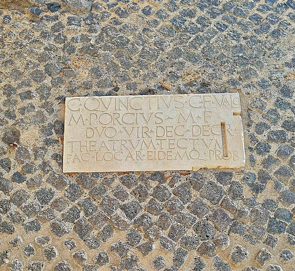 “Gaius Quinctius Valgus the son of Gaius, and Marcus Porcius the son of Marcus, duumvirs, in accordance with a decree of the city council let the contract for building the covered theatre and approved the work”.