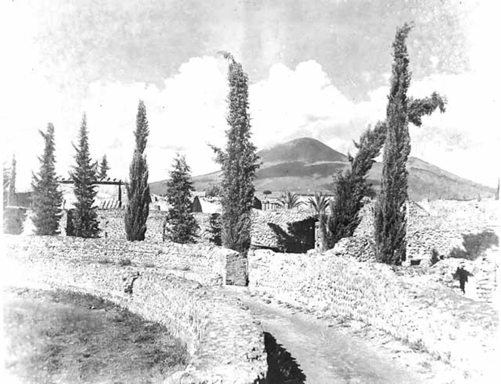 Looking north-east from upper level of large theatre towards Vesuvius, across garden of VIII.7.26 and 24 and with the passages to theatres, on the right.