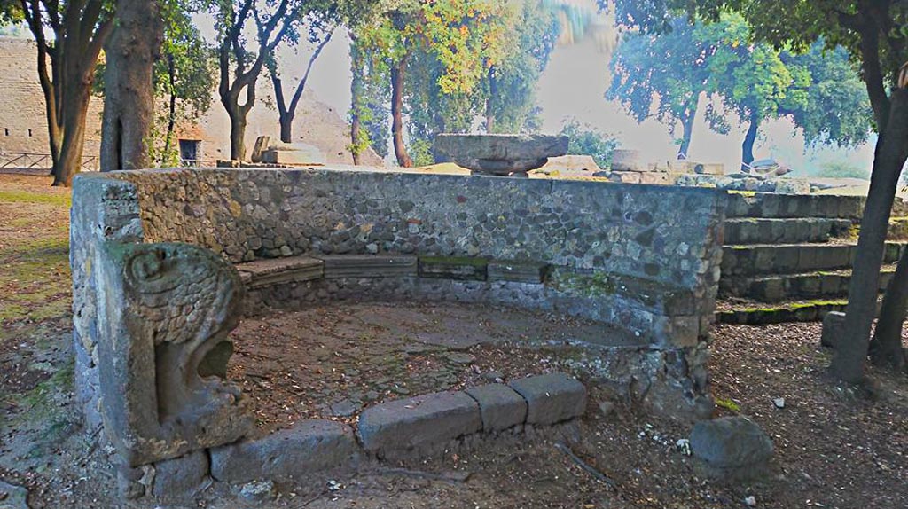 ![VIII.7.33 Pompeii Triangular Forum. 11th May 1765. Semi circular stone schola bench with sundial.PAH I, 1, p. 169, 11th May 1765, records this inscription found in the back of the seat: Fiorelli in Descrizione records a sundial with a tablet behind containing an inscription