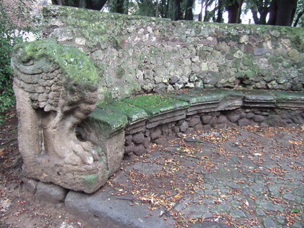 VIII.7.33 Pompeii Triangular Forum. December 2005. Front east end of semi-circular stone bench. The lion’s foot is missing.