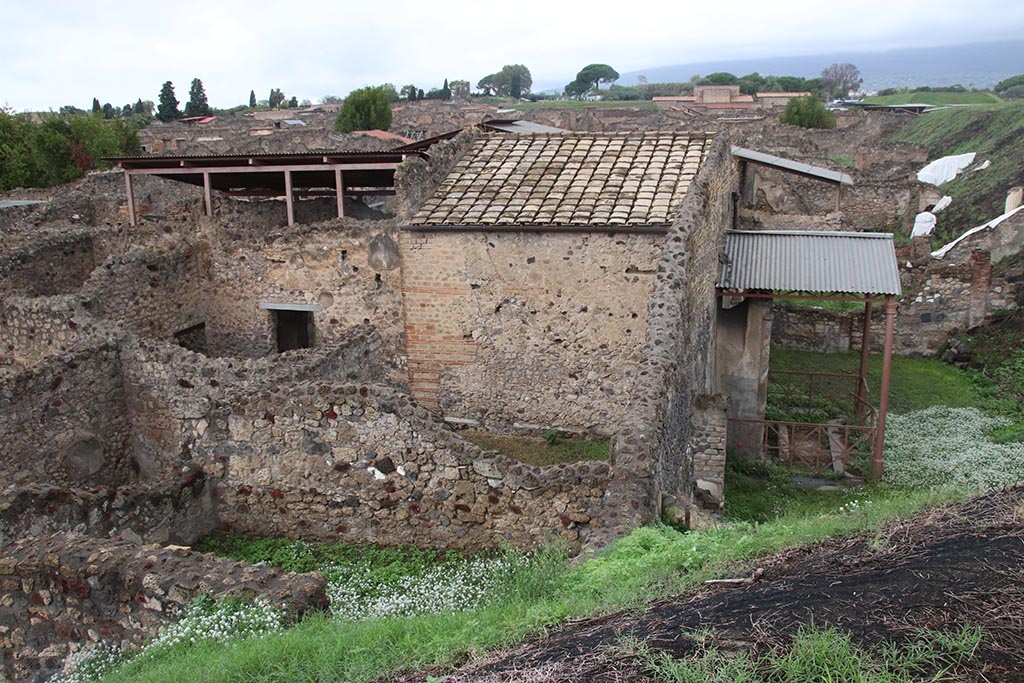 Looking west from above IX.7.12, Casina dell’Aquila, towards rear of IX.7.19, rooms m and l (L). Photo courtesy of Klaus Heese.