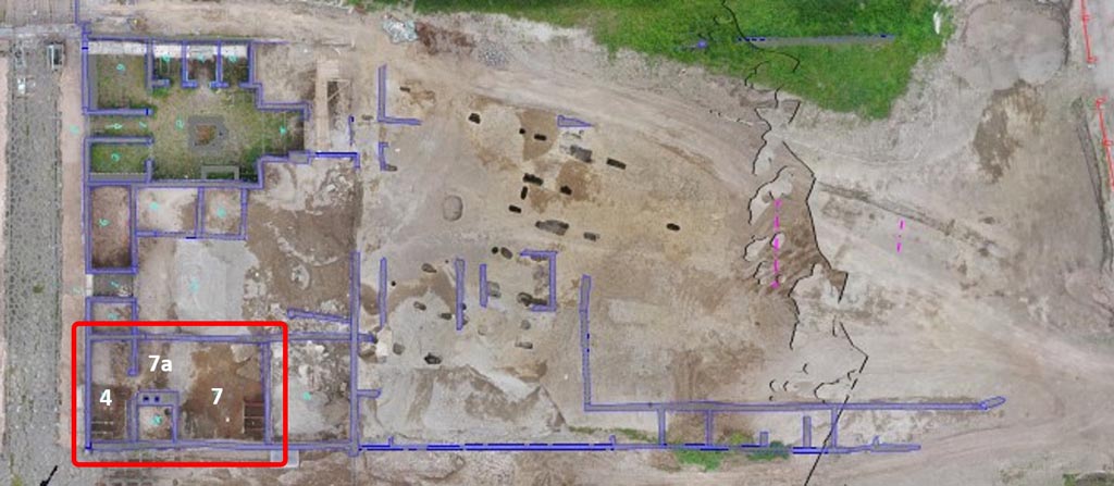IX.10.1 Pompeii. May 2023. Plan showing excavations underway in rooms 4, 7 and oven 7a.