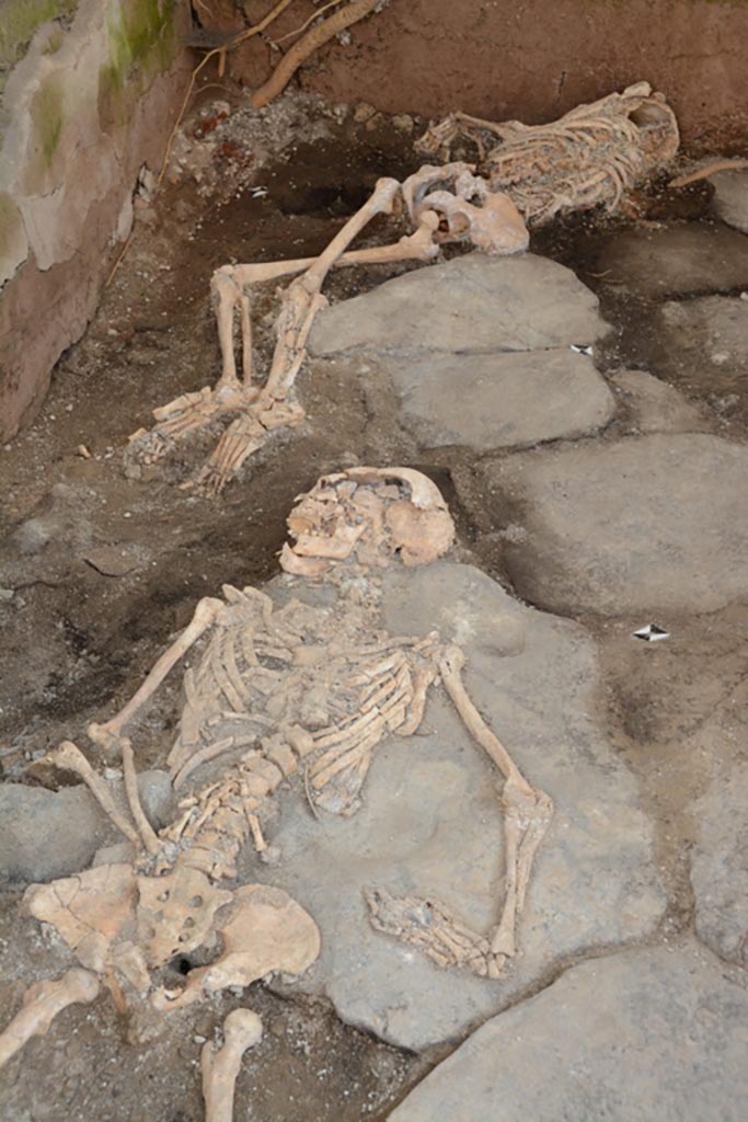 Le prime indagini antropologiche indicano due individui pienamente adulti, probabilmente donne sulla base delle prime analisi in situ, e di un bambino di età approssimativa intorno ai 3-4 anni. Gli individui sono stati ritrovati in un ambiente già scavato, dove erano rimasti solamente 40 cm. di stratigrafia intatta. Essi poggiavano a diretto contatto con il pavimento, e presentavano - unitamente alle evidenze di importanti processi di assestamento postmortem - una serie di traumi perimortem dovuti al crollo del solaio soprastante, i cui frammenti erano frammisti a lapilli pomicei bianchi, che caratterizzano le prime fasi dell'eruzione Pliniana del 79 d.C. a Pompei.