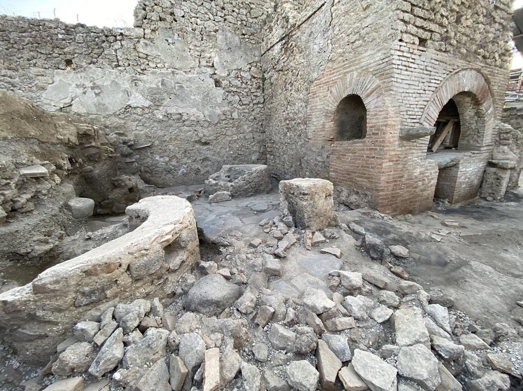 The ongoing excavation activities are currently involving the north-western sector of the insula (house number 1), in particular rooms 4, 7 and oven 7a, delimited by the northern front of via di Nola and the vicolo to the west of the insula. The partially visible structures already suggested the presence of a production plant with an oven, a hypothesis that was confirmed when the soil accumulated after the investigations carried out in the 19th century was removed. The latter, having concentrated not only on the living quarters at number 2 but also on the rooms facing via di Nola, had in fact involved our three rooms, fortunately without reaching the floor level everywhere.