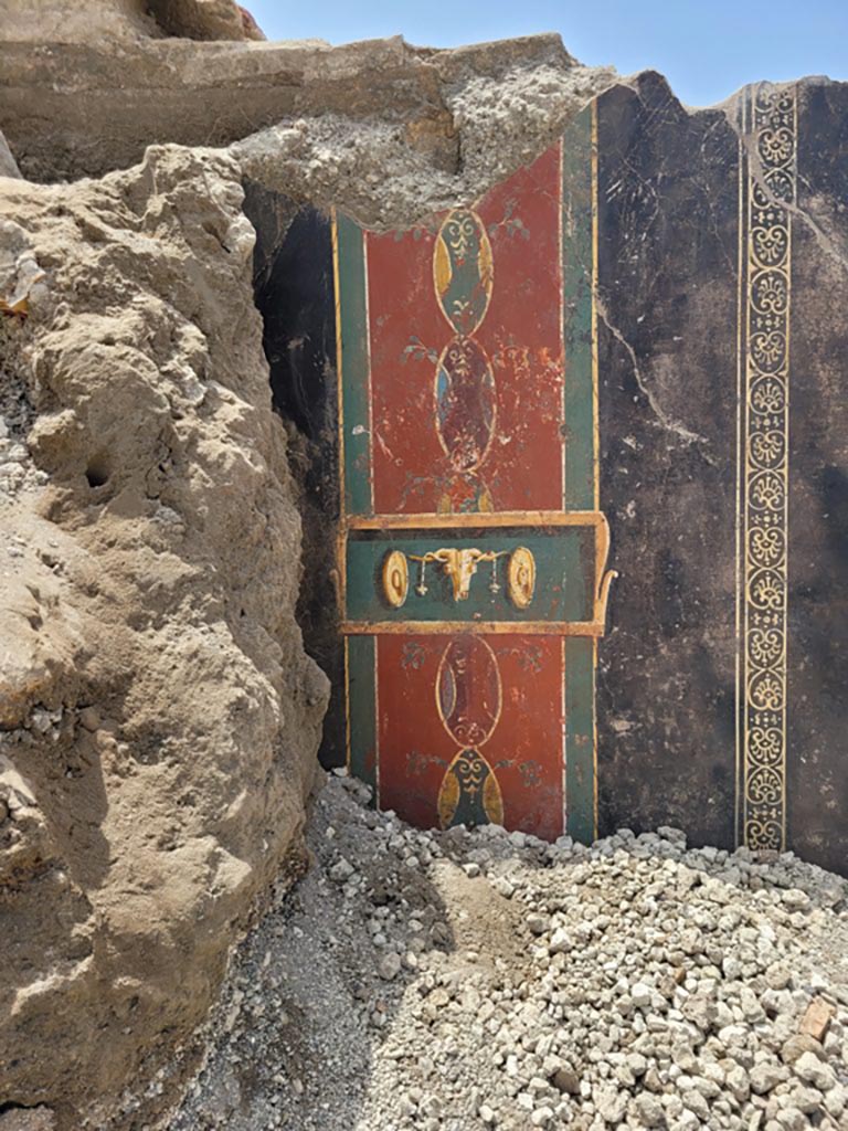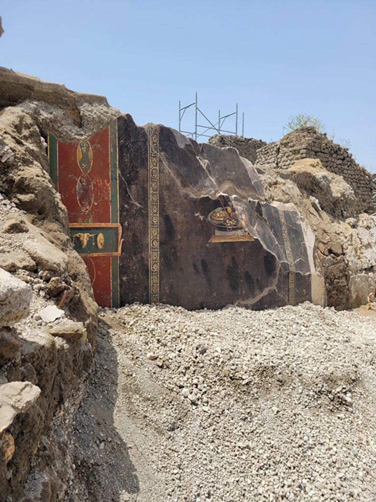 The partially visible structures already suggested the presence of a large atrium with the canonical succession of rooms on the eastern side and, on the opposite side, the entrance to the production sector of the oven. The atrium was freed from the resulting material of the nineteenth-century excavations revealing the collapse of the compluvium roof within the layer of white pumice and a residual portion of the volcanic layers from flow (cinerites) in the southern sector. This sector still partially encumbered by the collapses preserves the frescoed tablinum (14) which occupies the entire slope with, in the south-west corner, an access corridor to a still unexplored sector. The removal of volcanic ashes has revealed in this point the surviving presence of a frescoed panel with a black background with a still life.