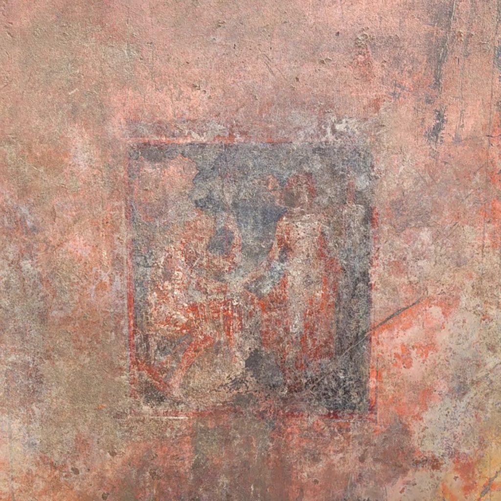 The partial deterioration of the painted plaster base on which the scenes of the last phase are laid reveals, in a position off-centre from the previous one, a similar scene belonging to an older decorative phase.