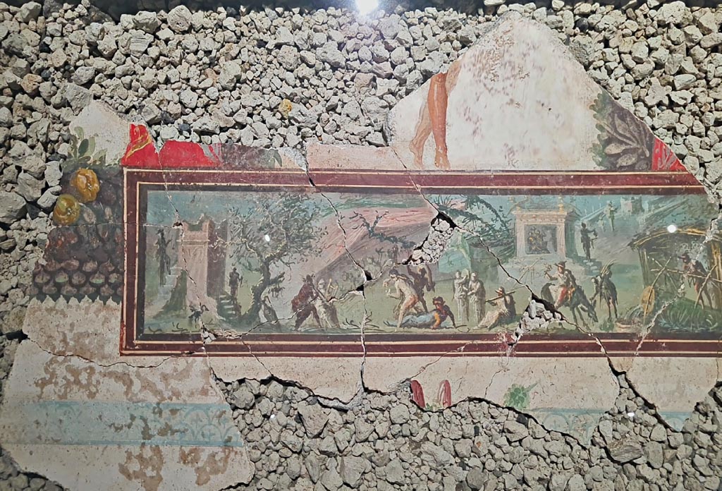 Fragment of ceiling with painting of a Nilotic scene, on display in an exhibition in the Palaestra entitled –