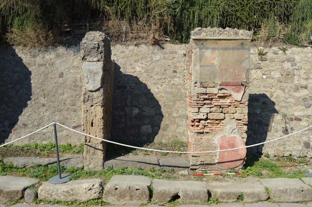 Pilaster between IX.11.7 and IX.11.8, west (right side of doorway at IX.11.7. October 2017.