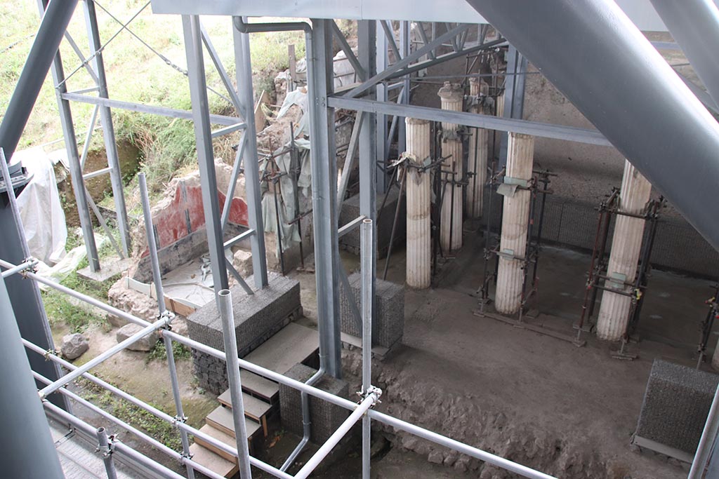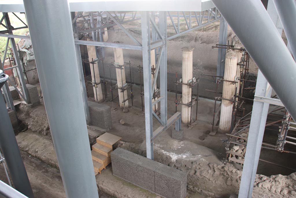 IX.11.7 (rear of) Pompeii. May 2010. Columns from peristyle being excavated on west side of IX.12.
