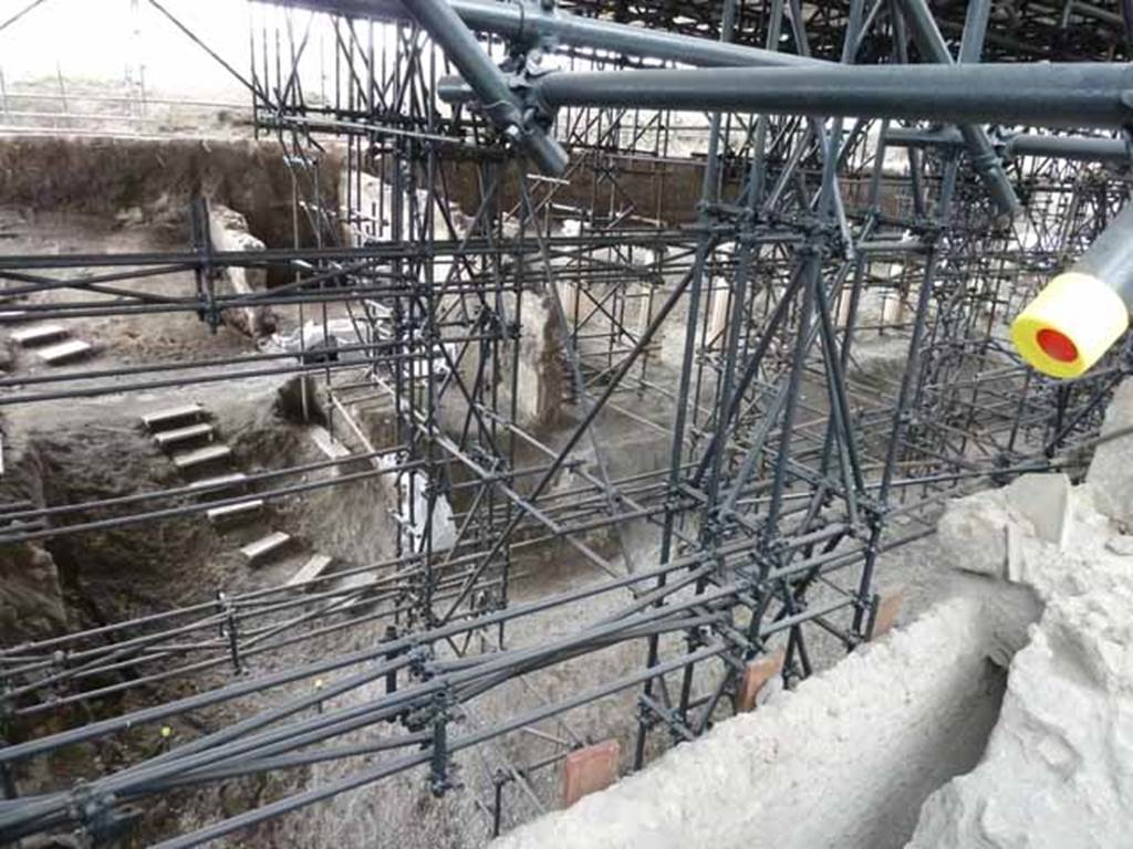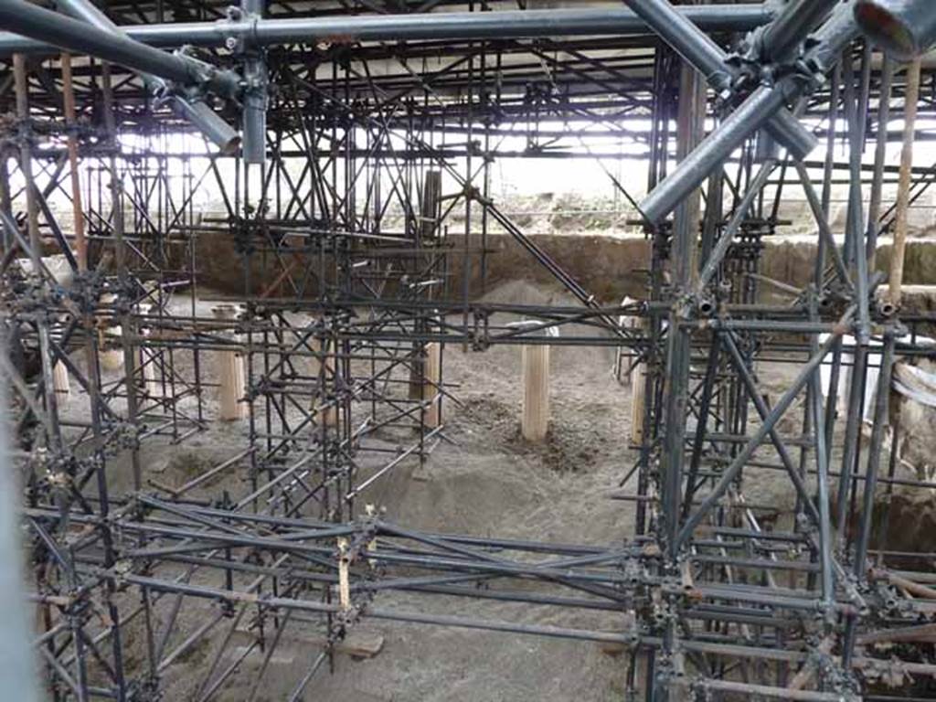 IX.11.7 (rear of) Pompeii. May 2010. Columns from peristyle being excavated at north end, on west side of IX.12.