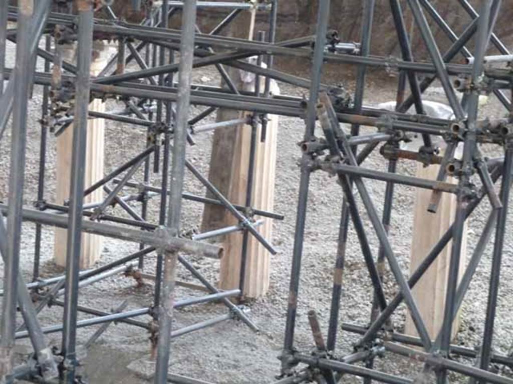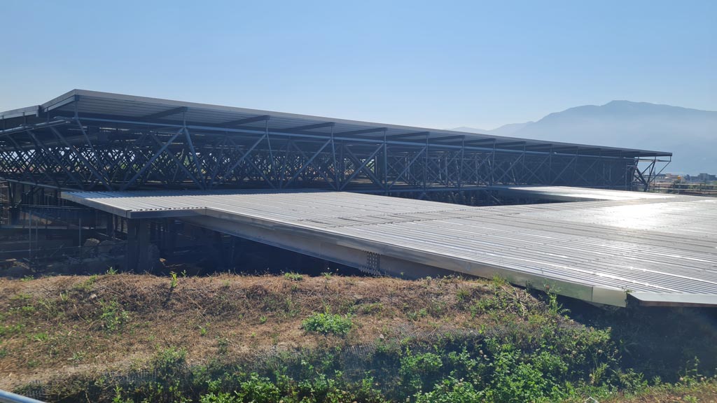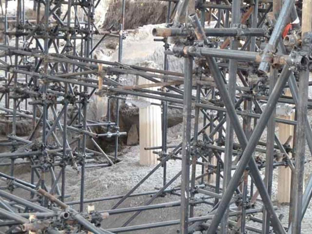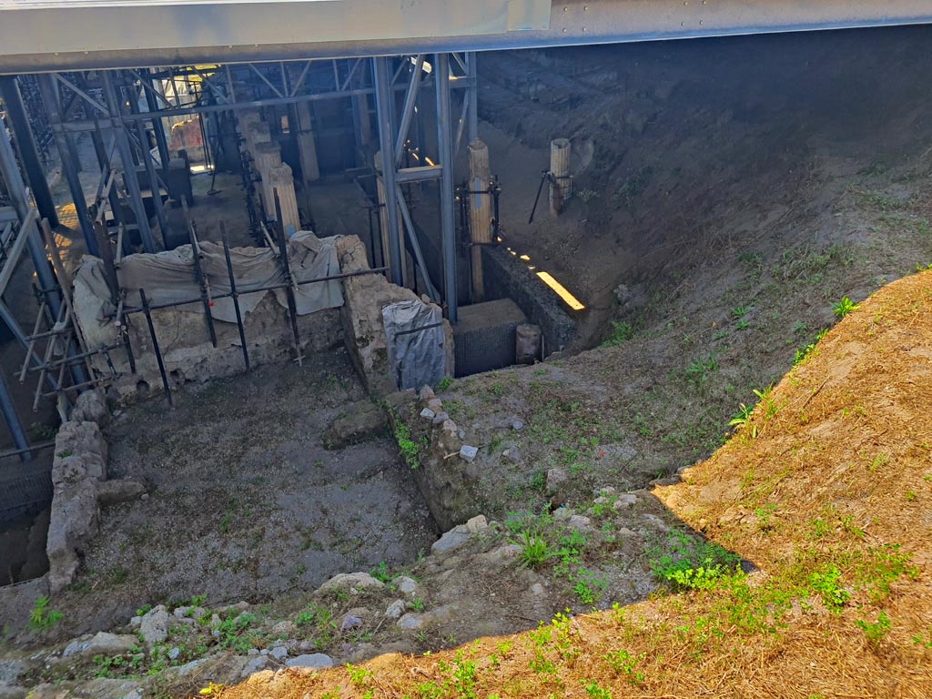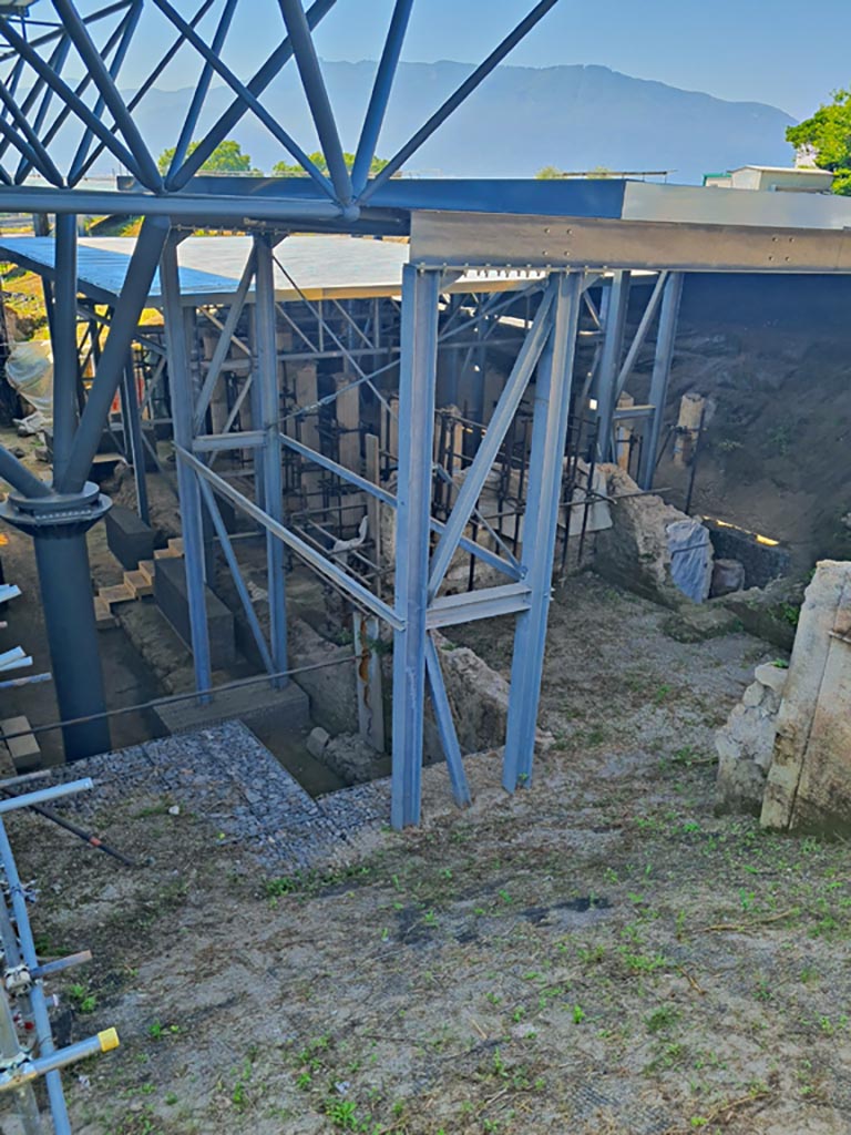 The front of the shop in question (IX.11.8) was protected by a short shelter/roof, protruding over the pavement for the length of three roofing-tiles, assembled over so many beams fixed into the façade and found in large part in their place in the state of carbon at a metre high above of the lintel.