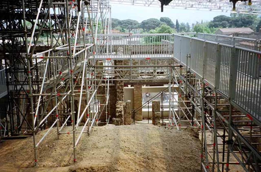 IX.12.1 Pompeii. 1912. Excavation of the upper floor, with the remains of the side balcony, hanging over the small roadway, (on left). and the area of the three windows of the cenaculum, overlooking the Via dell’Abbondanza, (centre and right).