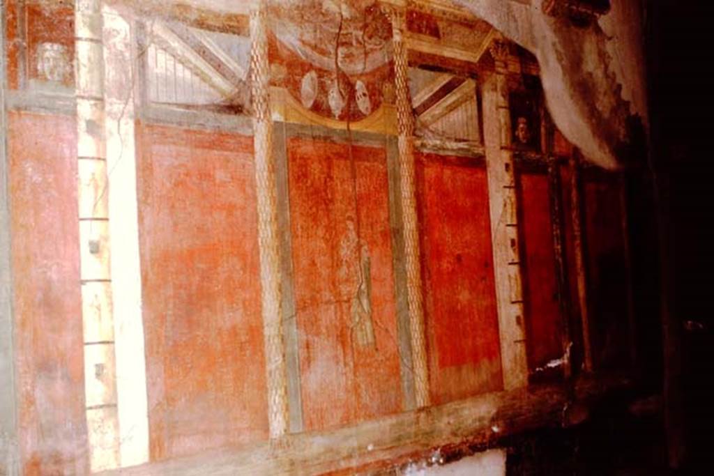 IX.14.4 Pompeii. 1968. Room 3, south wall with central painting of three figures. Photo by Stanley A. Jashemski.