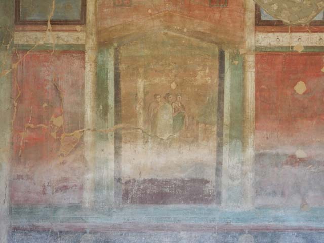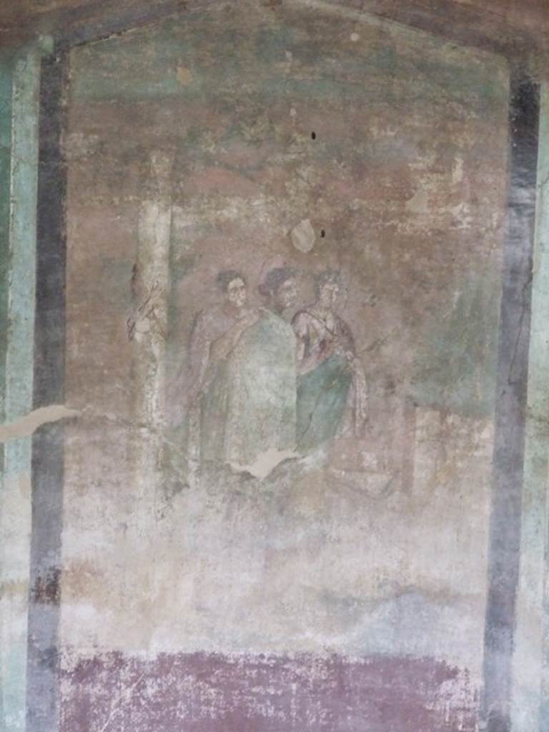 IX.14.4 Pompeii. May 2017. Room 3, detail of three women from central painting on south wall. Photo courtesy of Buzz Ferebee.