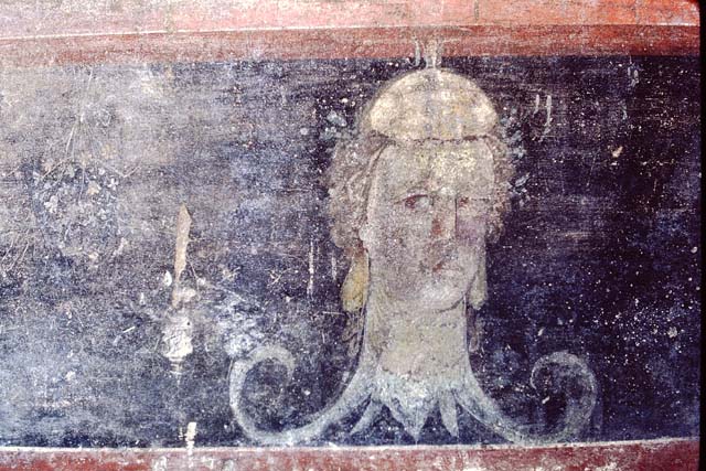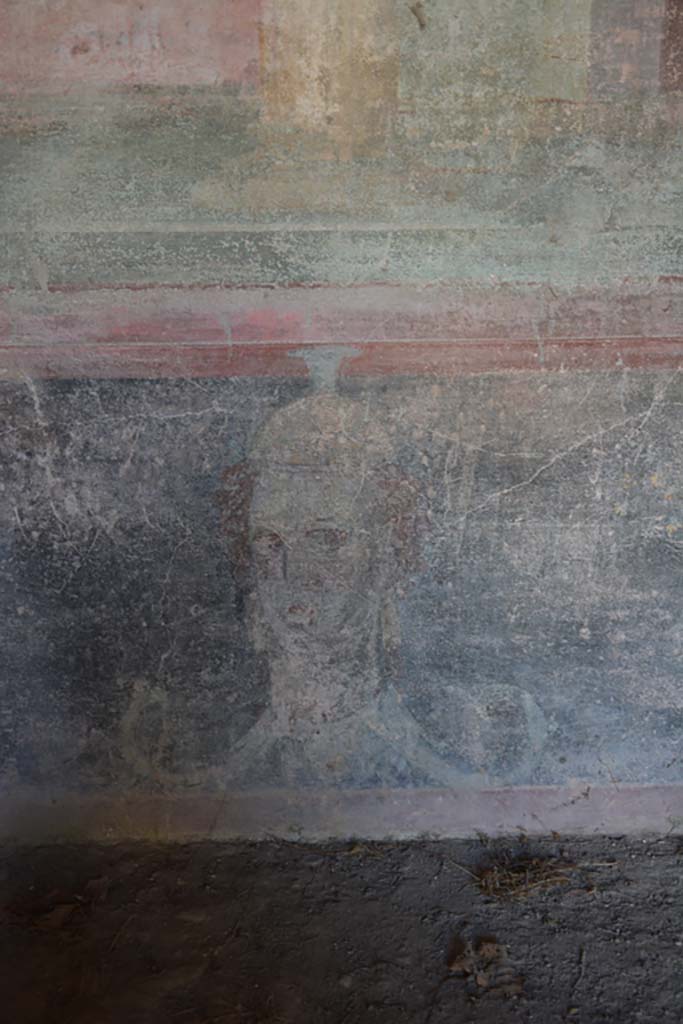 IX.14.4 Pompeii. December 2007. Room 3, painting of head on zoccolo of south wall at west end.
