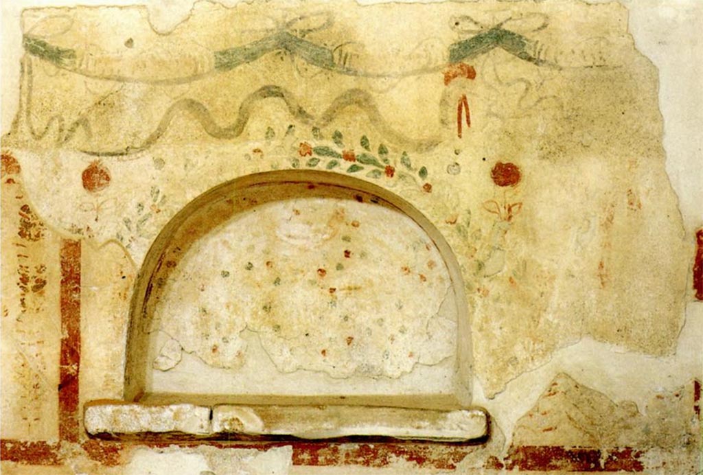the top is a garland of ribbons. Above the top of the niche is a serpent moving