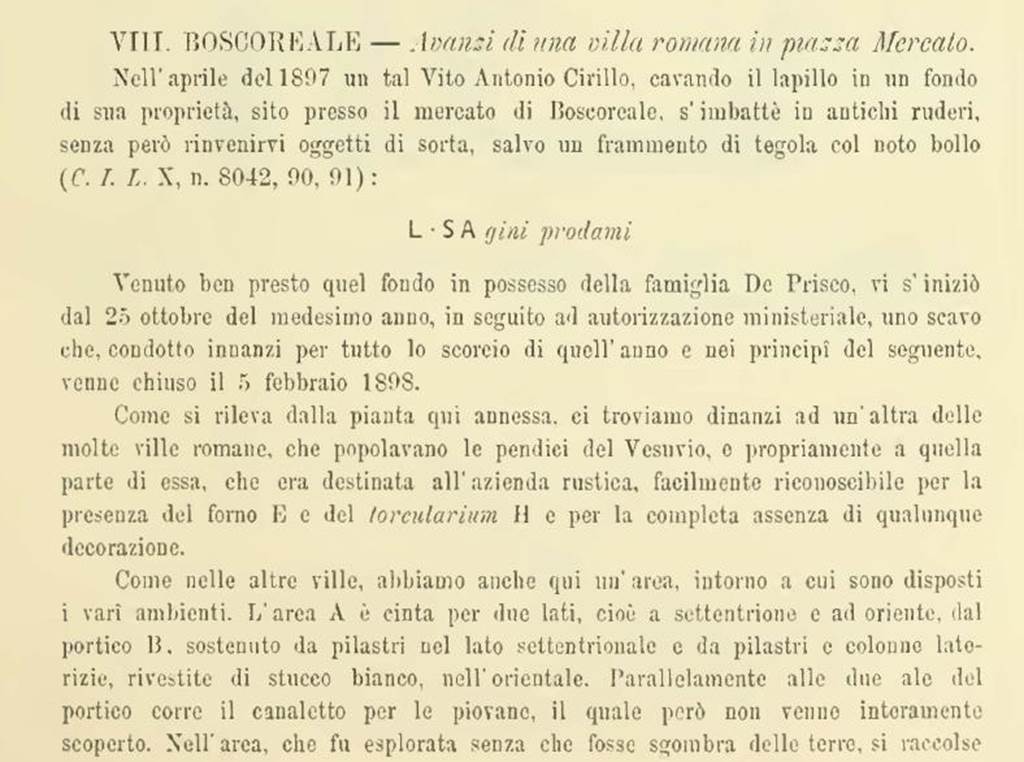 In April 1897 a certain Vito Antonio Cirillo, whilst excavating the lapilli on land he owned, located near the market of Boscoreale, encountered ancient ruins, but without finding any objects whatsoever, except for a piece of tile with a known stamp