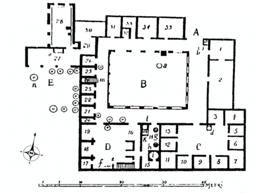 Pompeii. Rustic villa on the Agnello Marchetti property. 1923 The atrium, 'D', should be considered as an ergastulum, due to the presence of the stump for punishing slaves found there.