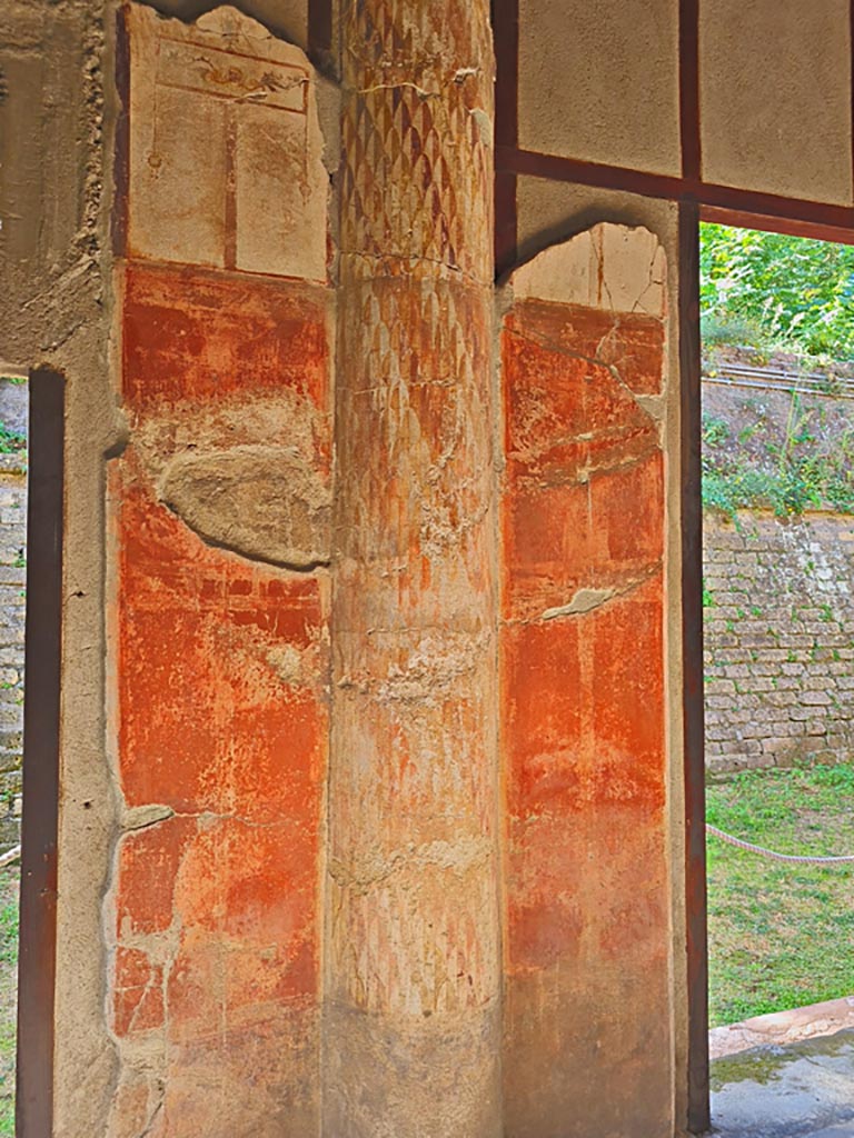 Oplontis Villa of Poppea, May 2024. Room 27, remaining painted decoration on west wall. Photo courtesy of Klaus Heese.