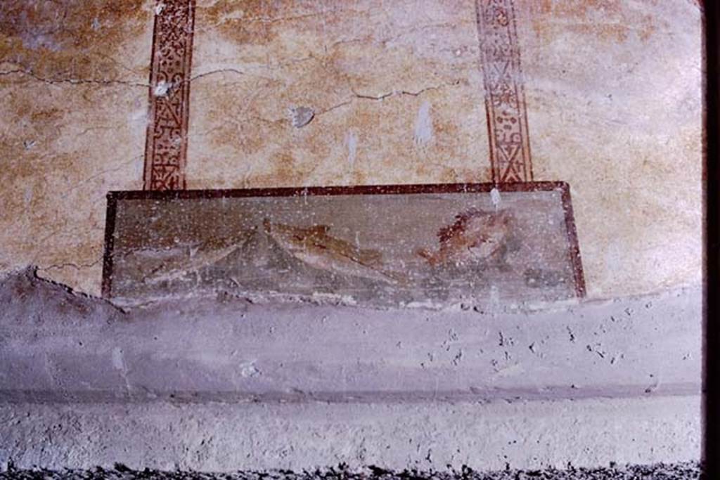 Oplontis Villa of Poppea, 1973. Room 27, painted panel with fishes. Photo by Stanley A. Jashemski.