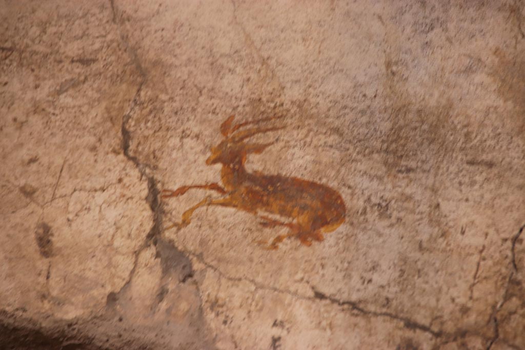 Oplontis Villa of Poppea, May 2024. Room 27, detail of painted deer on west wall, behind lararium. Photo courtesy of Klaus Heese.
